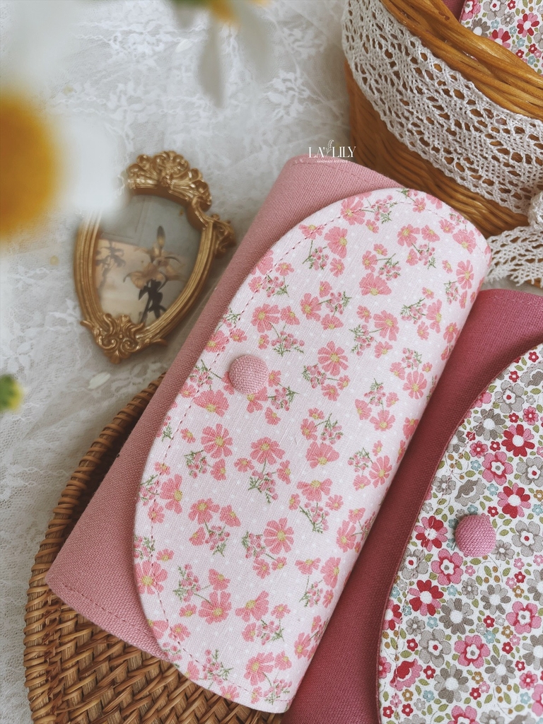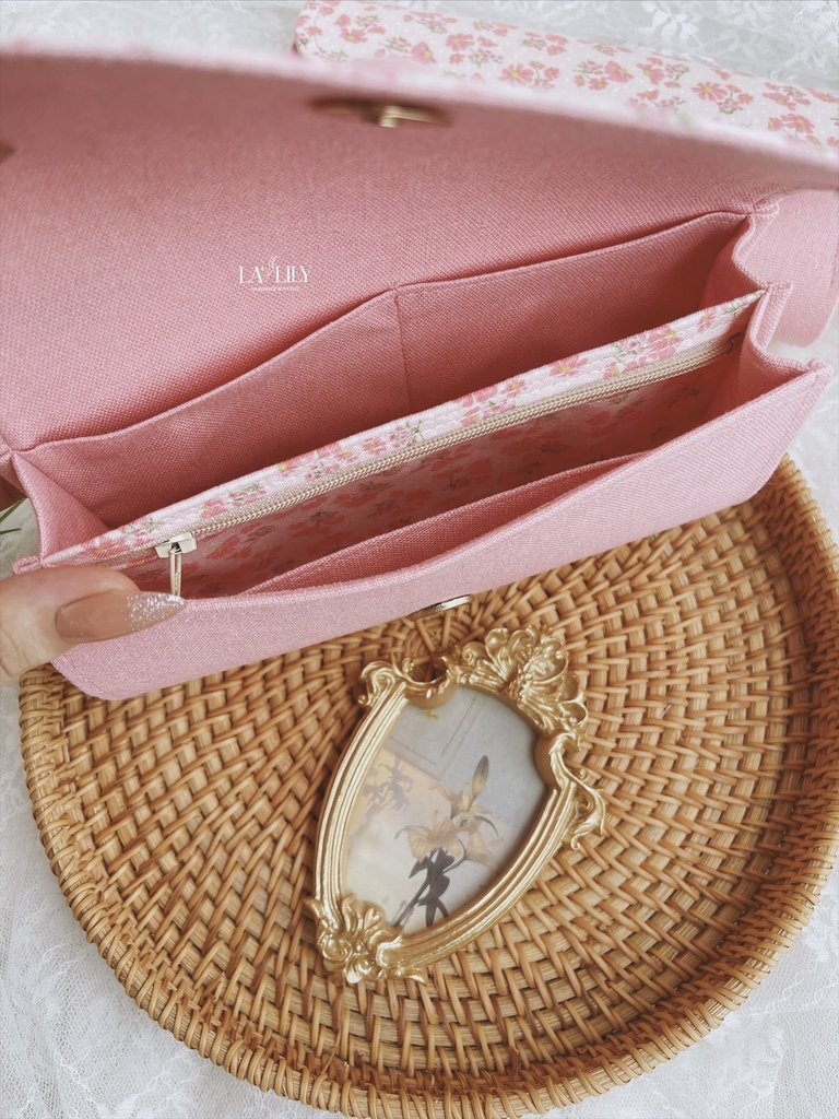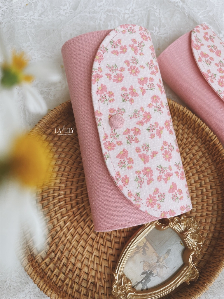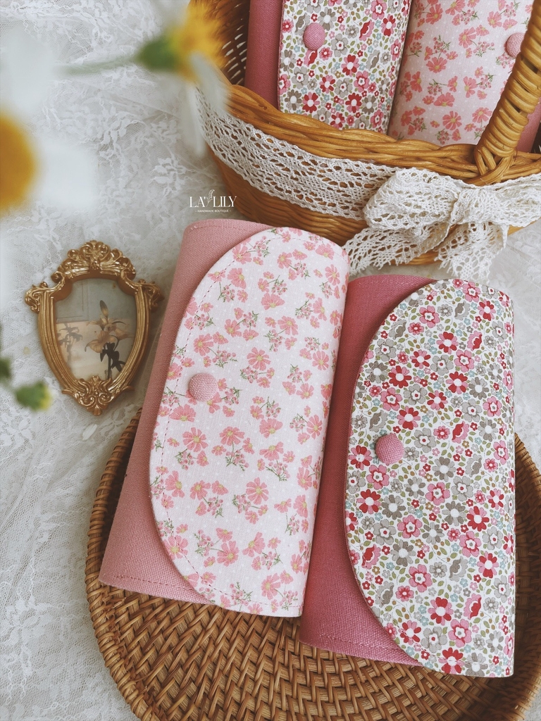 Chiếc ví xinh xắn mang phong cách vintage nhẹ nhàng, họa tiết hoa nhí lãng mạn trên nền vải pastel, điểm nhấn nút bọc vải tinh tế.